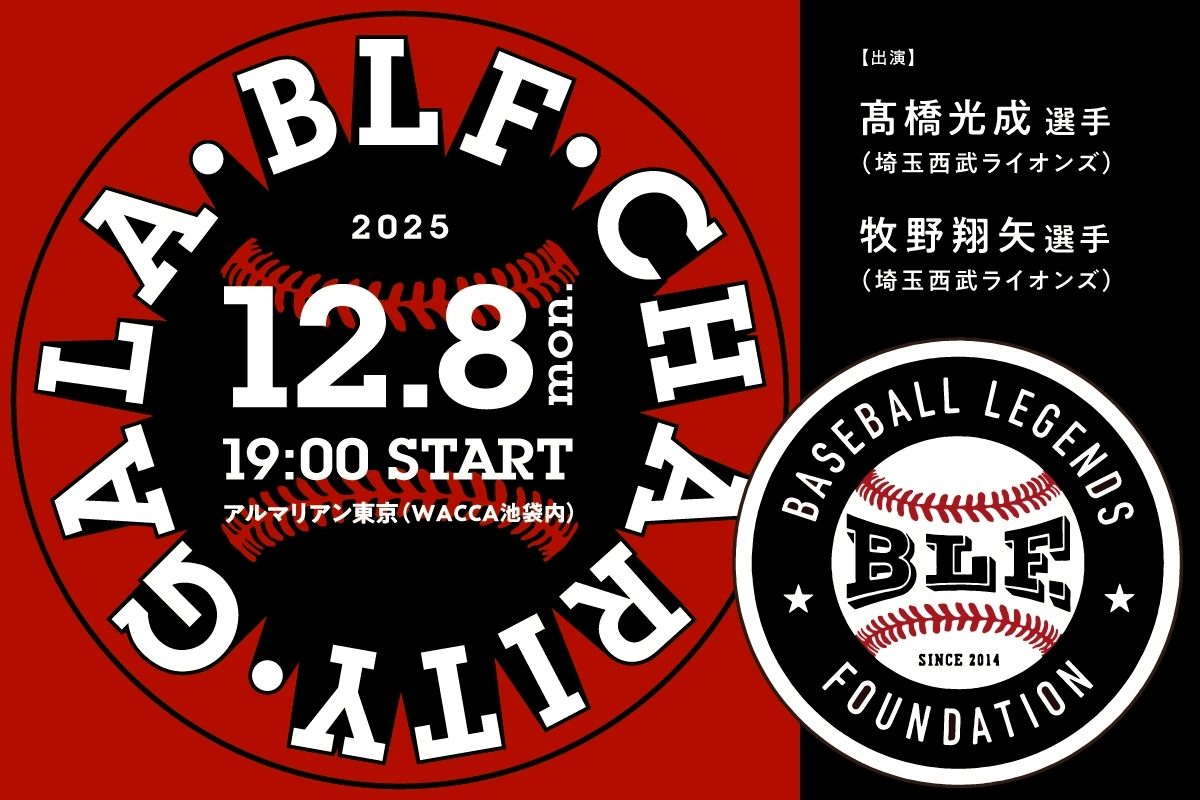 WACCA池袋8Fアルマリアン東京にて12月8日(月)にチャリティートークショー「BLFチャリティーGALA 2025」が開催されます。ゲストはプロ野球選手の髙橋光成選手・牧野翔矢選手が登壇予定。総合司会は関野浩之アナウ……