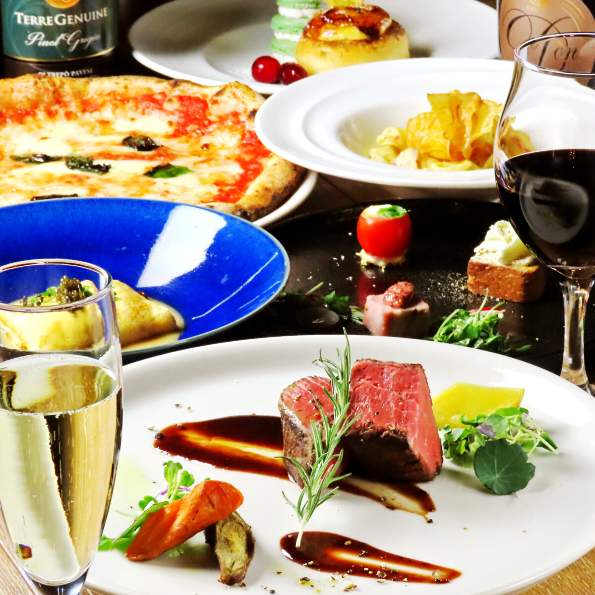 豪華な前菜に究極のピッツァ・マルゲリータ、メインディッシュの「牛フィレステーキ」などクリスマス仕様の豪華な特別ディナー。